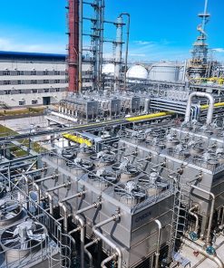 Water is pumped from bottom basin and sprayed over the below coil. At the same time, ambient air is induced by axial fan to coil surface and fin tube surface. On the coil surface, enough latent heat and sensible heat is exchanged between air and water, that let process gas give up heat and condensed to liquid. Then the hot and saturated air is drawn through the drift eliminator and fin tube, and the possible plume will be abated by fin tube, then discharged into the atmosphere. The unevaporated water falls into the basin and goes to the recirculation again.