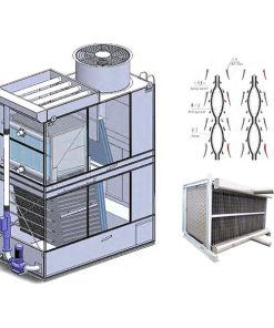 The cooling water is evenly sprayed from the upper part of the plate tube group to the outer surface of the plate tube to form a thin water film. After the water film absorbs heat, part of it is converted into water vapor. The fan at the top of the unit draws air into the unit, swept over the water film, strengthens heat exchange, and promotes the evaporation of the water film; Endothermic cooling, falling into the bottom sump. Then the fan discharges hot air and water vapor.